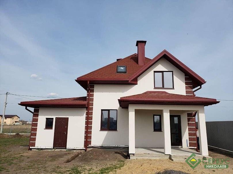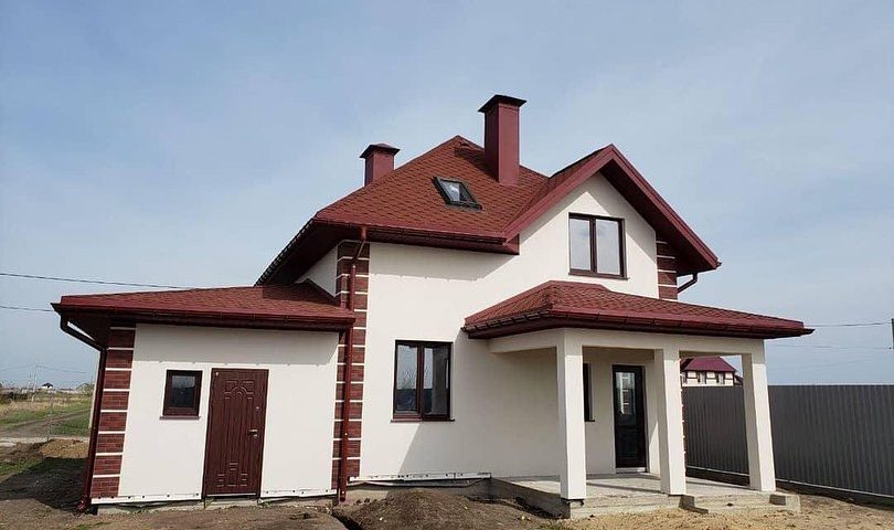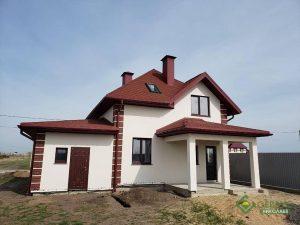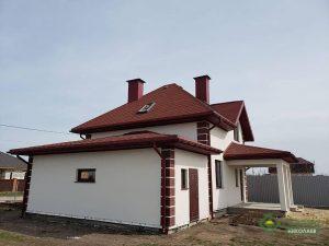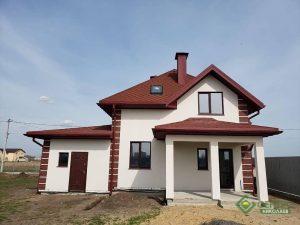 Дом построен по комплектации «Стандарт» (2800*1250*164мм), фундамент – ленточный, кровля битумная черепица Айко, фасад на 100мм полистирола штукатурка «Бараник» + клинкерная плитка как декоративный элемент на углах. Окна с энергосбережением, металлическая входная дверь.