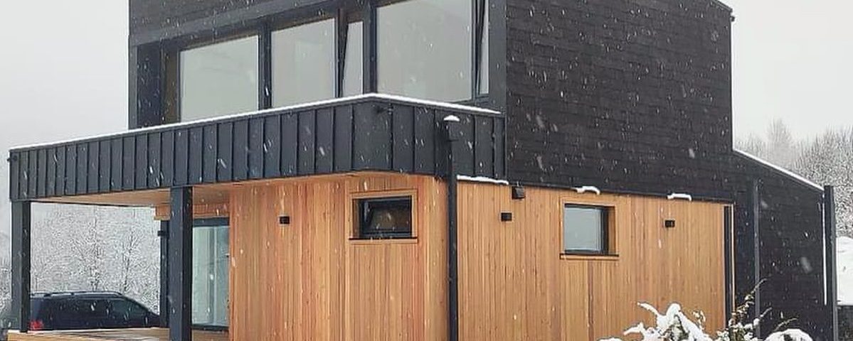 Двухэтажный дом в стиле хай-тек имеет площадь 102 кв.м. и все необходимое для комфортной жизни.