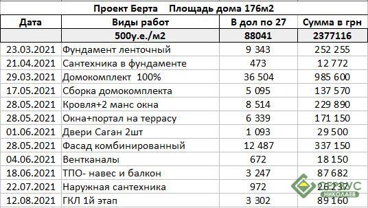 Дом построен по индивидуальному проекту, после чего мы добавили его в нашу копилку проектов и назвали его «Берта». Планировку дома Вы можете посмотреть по этой ссылке. Многие задаются вопросом, сколько же стоит построить дом в 2021 году? Мы составили смету, в которой указаны цены на работы, во сколько обошлось строительство этого дома. С ценами Вы можете ознакомиться ниже.