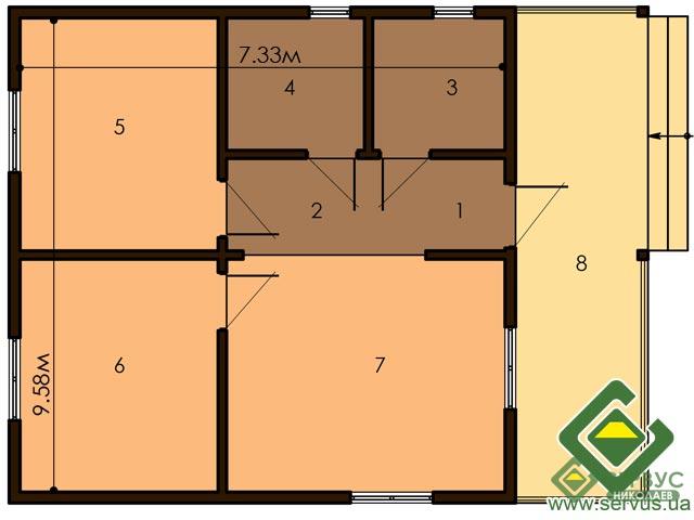 По проекту в доме предусмотрены 2 спальни, гостиная с выходом на террасу, кузня и ванная комната, для небольшой семьи есть все необходимое.