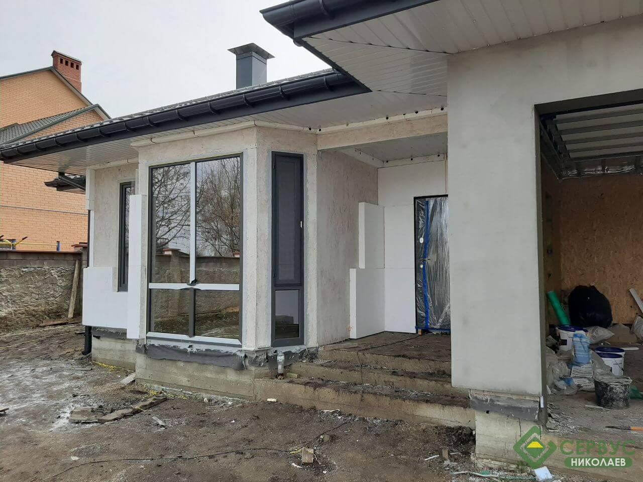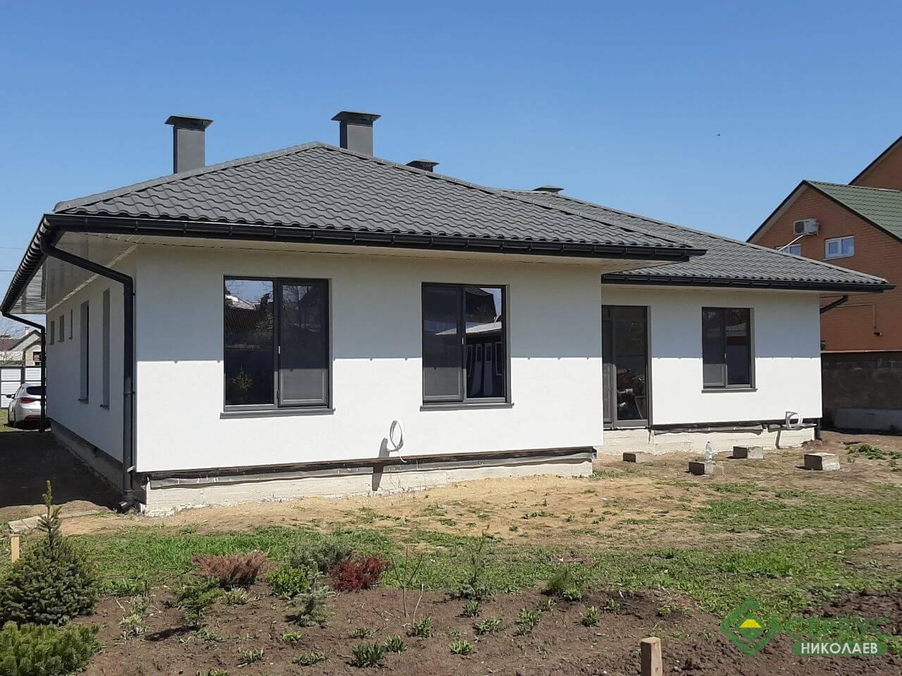 Минеральная штукатурка в светлых тонах и темные контуры на окнах, темная крыша и роллеты, придали дому классический стиль. Получилось очень хорошо.