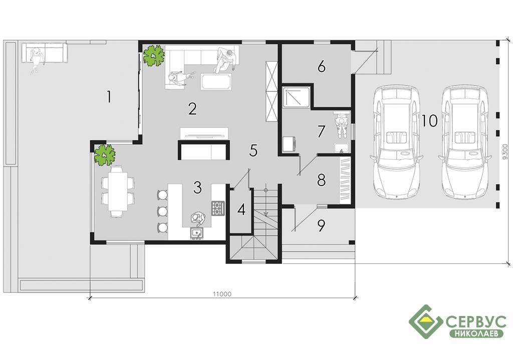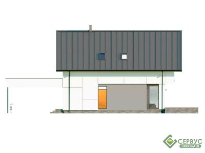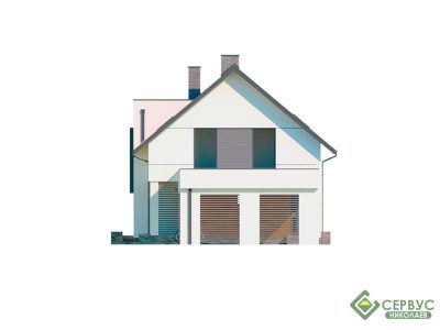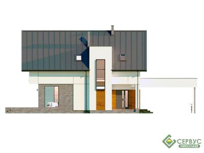 Стильный дом в современном стиле. Два полноценных этажа. Просторные гостиная и кухня разделены частично. Большие витражные окна обеспечивают все помещения естественным светом. Второй этаж — зона отдыха на 3 спальни. Просторный гардероб на 2-м этаже. В проекте предусмотрен навес на 2 автомобили.