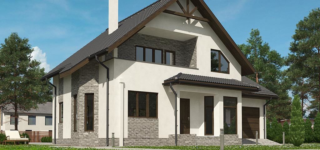 Красивый двухэтажный дом с гаражом и удобной планировкой, идеальный выбор для загородного жилья.