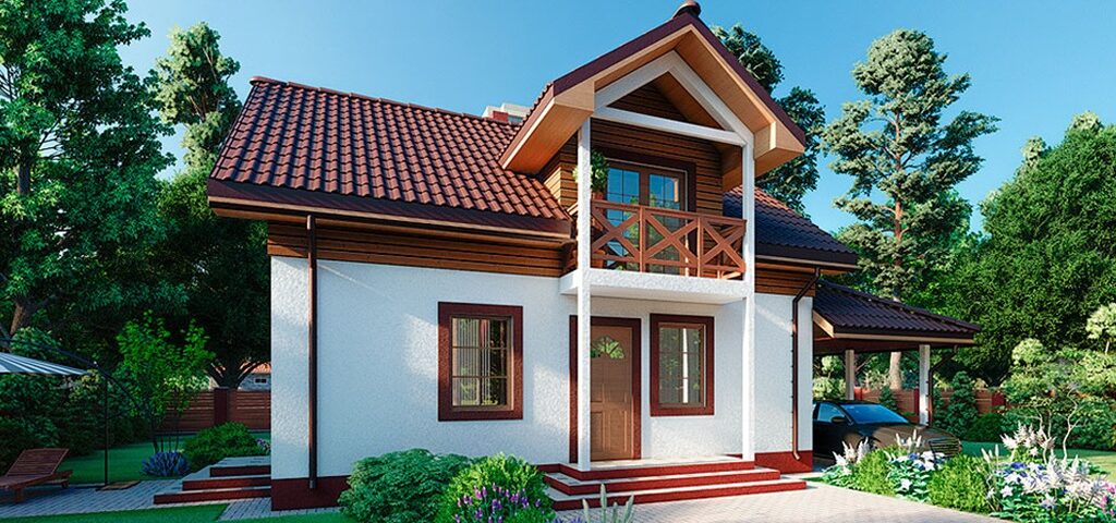 Красивый загородный дом с мансардой, балконом и навесом под авто.