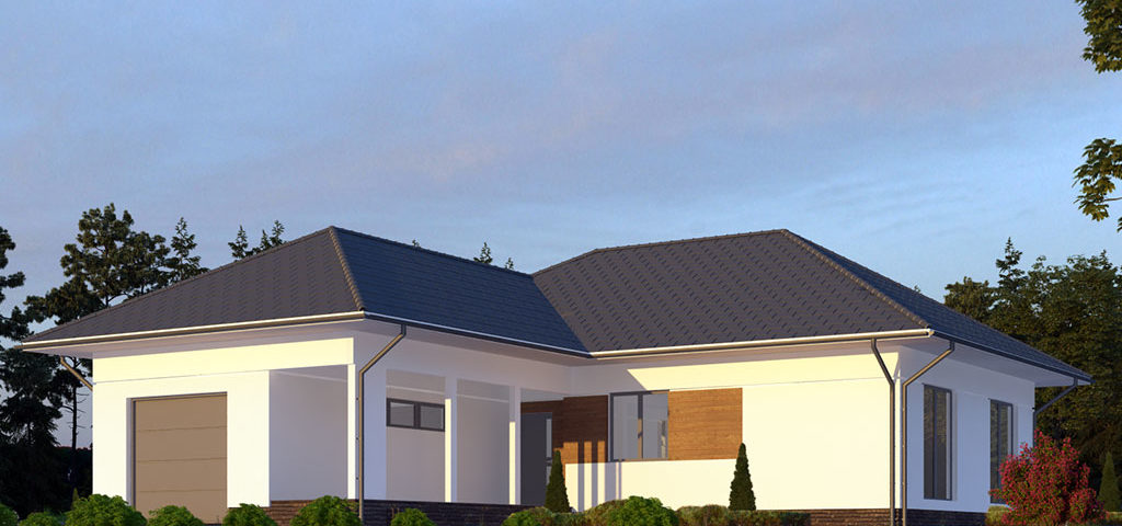 Просторный одноэтажный дом с гаражом. Большая кухня-гостиная. Две спальни и неотделим кабинет. Проект для тех, кто любит свободу и удобство.