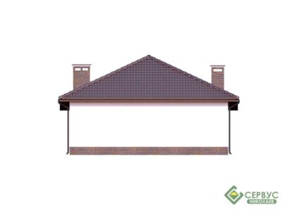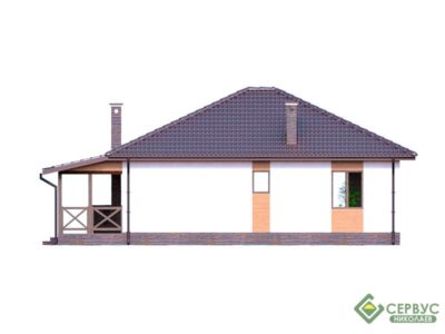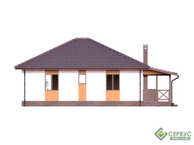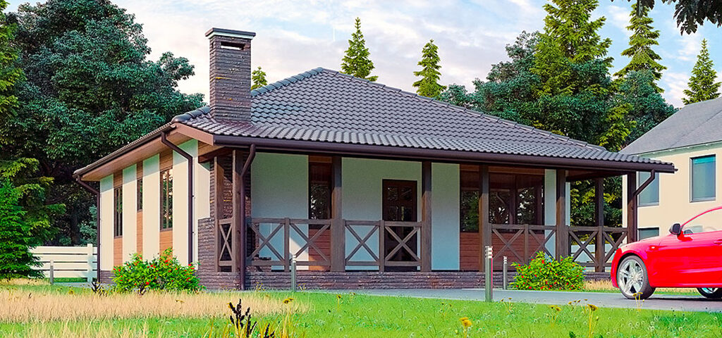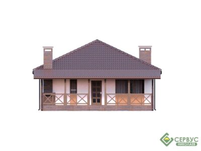 Одноэтажный дом с большой уютной террасой. Удобная планировка с просторными комнатами. Проект прекрасно подойдет для загородного жилья для небольшой семьи.