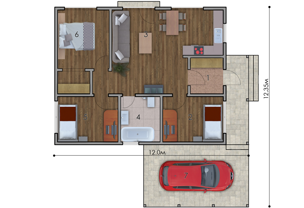 Таллинн — это компактный красивый, недорогой одноэтажный дом с навесом под авто. Этот проект — выбор для тех, кто ценит функциональность и практичность, он идеально подойдет для проживания небольшой семьи.