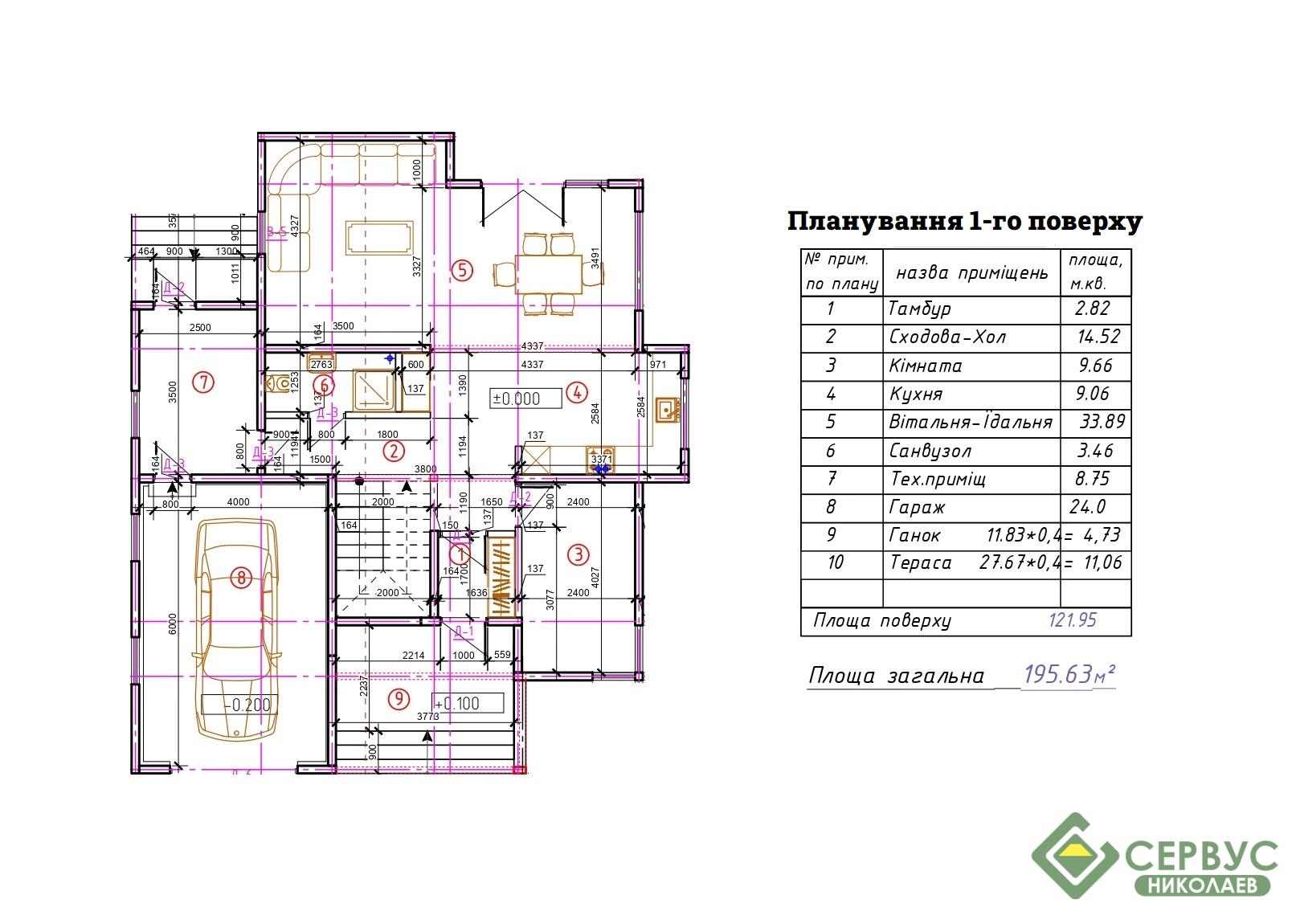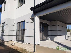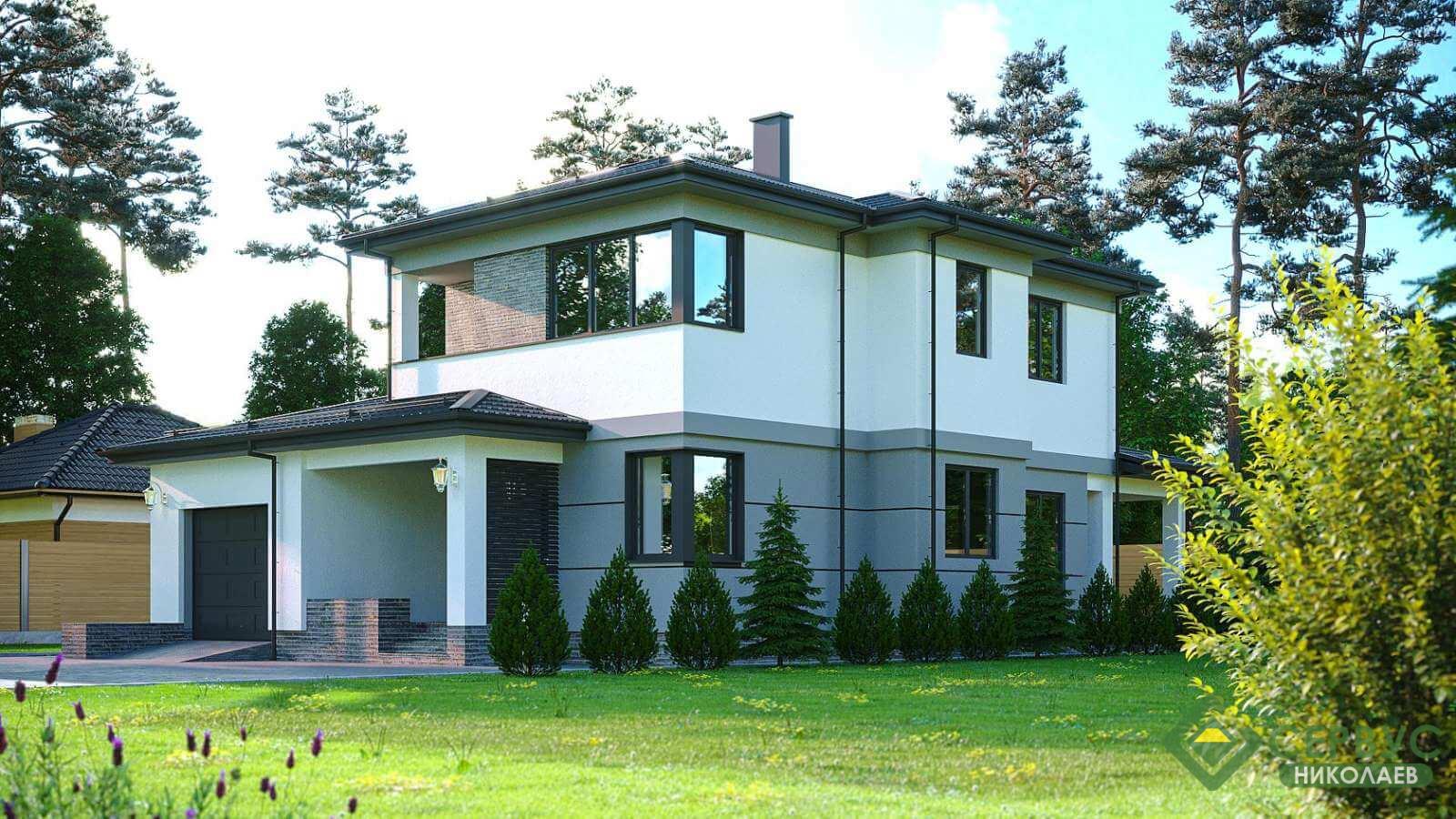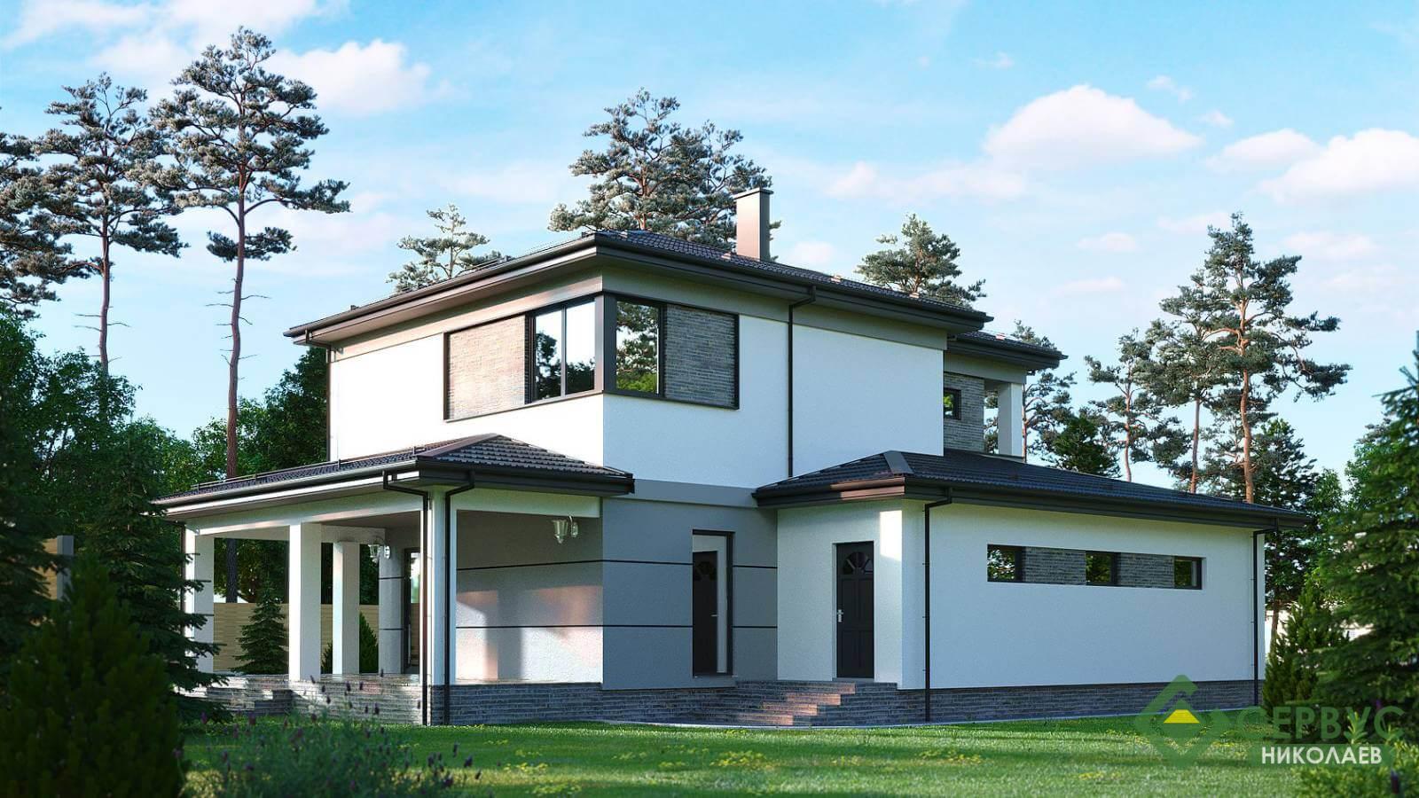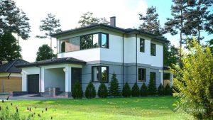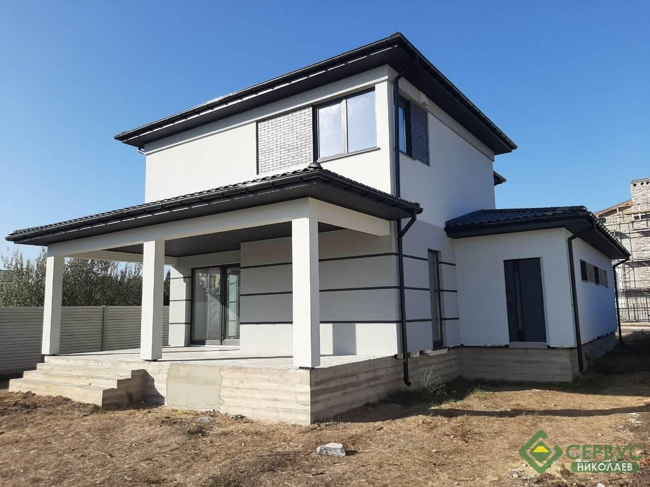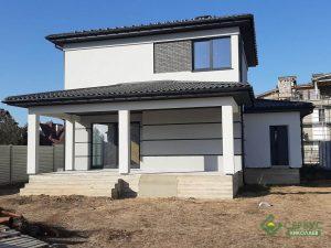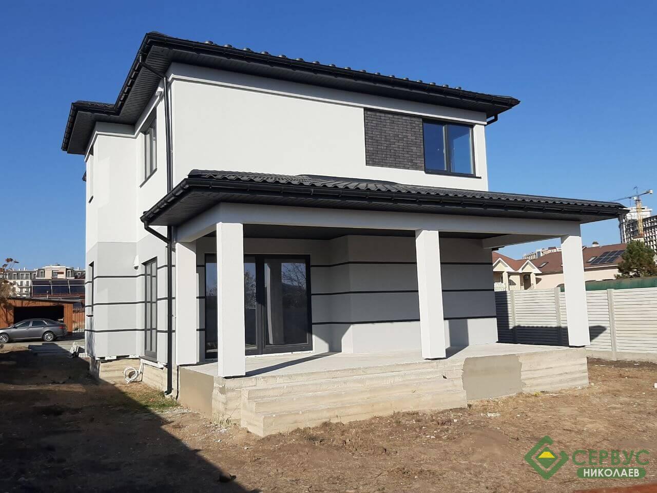 Это индивидуальный проект, который наши архитекторы адаптировали под строительство по СИП технологии, а также были учтены все пожелания клиента. Двухэтажный дом площадью 195 м2 вместил в себя на первом этаже большую гостиную-столовую, кухню, гараж, комнату, террасу, а на втором этаже разместились три спальни, ванная комната, гардероб и балкон.